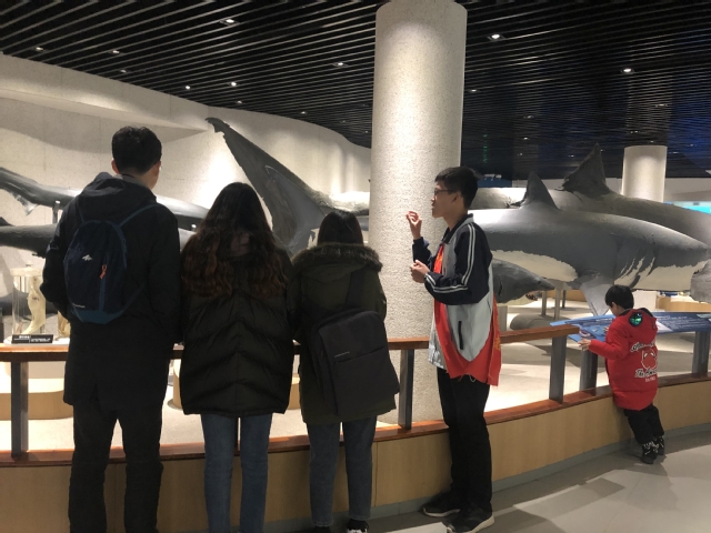 冬日微凉的午后,鱼山科普志愿者协会的同学早早地来到了师苑门口等待活动参加人员前来集合。点名集合完毕后,在黎梦、钟珺联和王晓乐同学和社团干事的带领下,大家开始步行前往青岛水族馆。到达水族馆后,负责接应的李雨霏同学已拿着海底世界的通行证在门口等候。在分发了鱼山科普志愿者协会活动纪念章以作活动参与者标识后,大家按照水母宫、标本馆、淡水生物馆的顺序进行了为时两个小时的参观。参观过程中,同学们表现出对海洋生物的强烈喜爱与好奇。在参观完水族馆后,同学们开始了为时一小时的志愿讲解。在活动举办之前,鱼山科普志愿者协会协会为参加的同学量身定制了讲解培训,同学们都对科普志愿讲解和海洋生物知识有了一定的了解,于是在社团干事的帮助下,很快适应了讲解工作,进入了积极向上的讲解状态。在讲解过程中,同学们落落大方,态度亲切,用词准确,耐心地回答了游客的问题,给游客们带来了良好的游览体验,展现了海大学子的优良精神面貌。最后在拍完合照后,大家伴着淅淅沥沥的细雨回到了学校,结束了这次参观及讲解之旅。