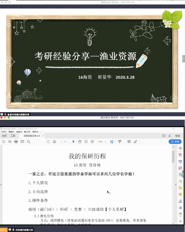 第二位进行分享的党员是2016级海洋资源与环境专业的崔晏华,在本校渔业资源专业研究生初试中排名专业第2。首先他分享了自己在考研方向上的选择,并在考研方向确定方面给出了一些建议。在考研资料和方法方面,他详细介绍了自己在数学农、专业课、政治和英语上的时间安排和复习方法,并推荐了一些相关的复习资料。最后,他给诸位考研的同学提了四条建议:1、找个研友一起努力;2、及时调整自己的学习计划;3、保持良好的心态;4、适合自己的方法才是最好的。