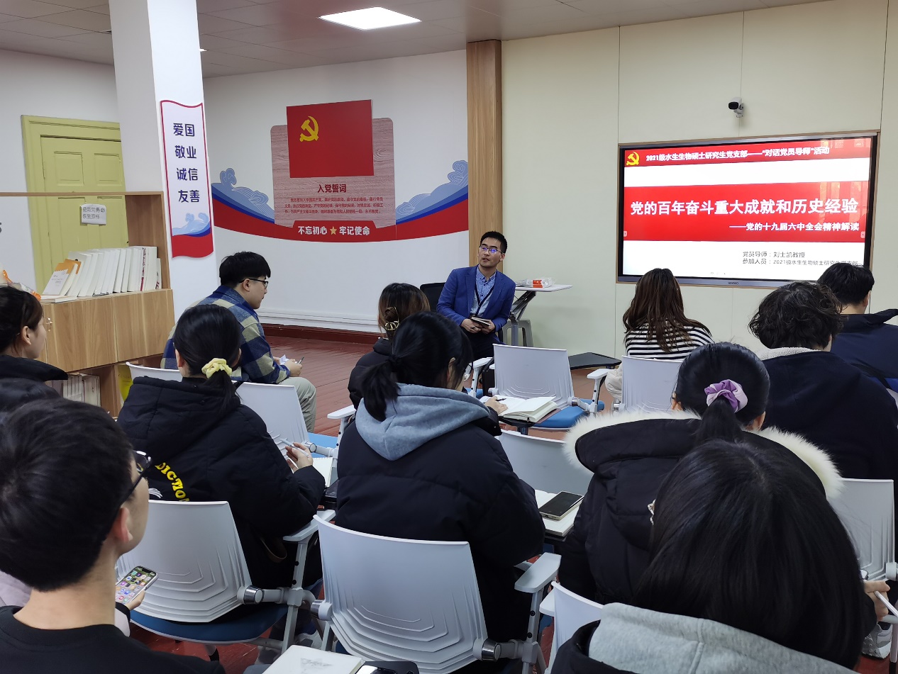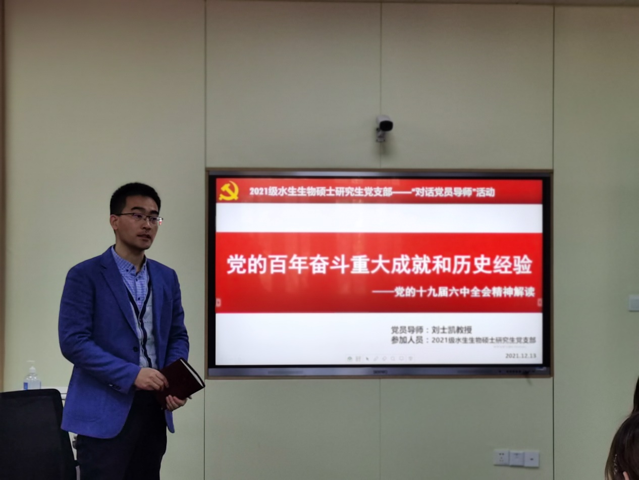 2021年12月13日,御宅屋 2021级水生生物硕士研究生党支部党员导师刘士凯老师以党的百年奋斗重大成就和历史经验为主题为支部党员进行了党的十九届六中全会精神的解读。会议由党支部书记张逸菲同志主持。