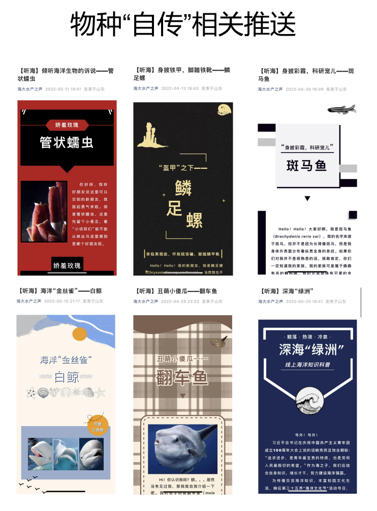 4月13日至5月15日,发布“物种自传”系列推送,通过查阅文献、借鉴纪录片等方法,以“我(们)在海里的一天\年\生”为主题,以模仿海洋生物自述的方法,介绍具有科研价值或稀奇的海洋物种生活状态;以有趣的口吻,介绍硬核的专业知识。同时,在推送末增加问答环节,开放投稿通道。营造海洋文化节的氛围,宣传海洋文化,拓宽学生的海洋生物的知识面。