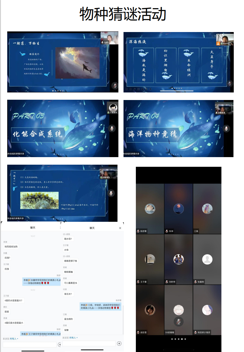 5月19日之前,进行物种猜谜活动准备,与御宅屋 2021级本科生班级相联合,进行线上活动宣传,召集同学前来参会。三位主讲人进行专题资料的收集整合与学习,进行内容的准备。5月19日晚6点30分物种猜谜线上活动如期开展,来自各班的水产学子齐聚于此,共赴知识盛宴。首先三位主讲人分别介绍了鲸落、热液、冷泉,在介绍完三个海洋生态系统后就开始了激动人心的猜谜环节,各班同学积极竞答,展现出水产学子丰厚的专业知识储备。线上活动结束后,总结活动,制作推送,送出礼物。