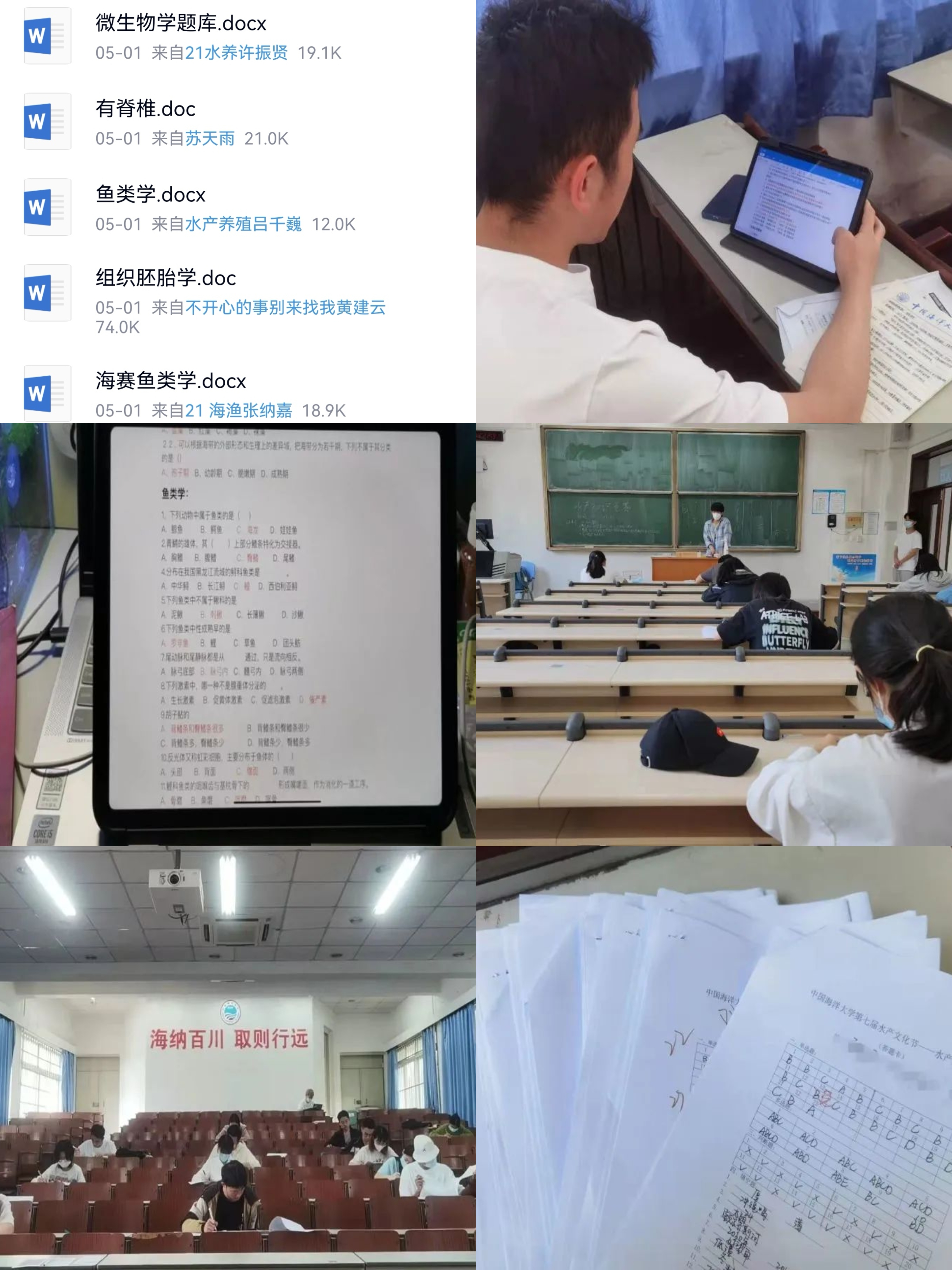 4月25日至5月12日期间开展“水”与争锋——水产常识挑战赛,整理、制作并完善了涵盖微生物学,普通动物学,鱼类学,组织胚胎学,细胞生物学,植物学,海洋时政,海洋地质学等知识的8个题库。5月12日至5月14日期间,完成制作并修正了两套竞赛试题。5月21日下午2:00-3:00“水”与争锋——水产常识挑战赛于鱼山校区和崂山校区同步开展,每个考场均有两位监考员负责监考,试后当日完成评卷与订正工作。排名依据分数由高到低的顺序,分数相同者交卷时间较早的排名靠前,交卷时间精确至秒。最终产生出一等奖1名、二等奖2名、三等奖3名以及优秀奖4名,并与5月23日发布推送公布最终结果。