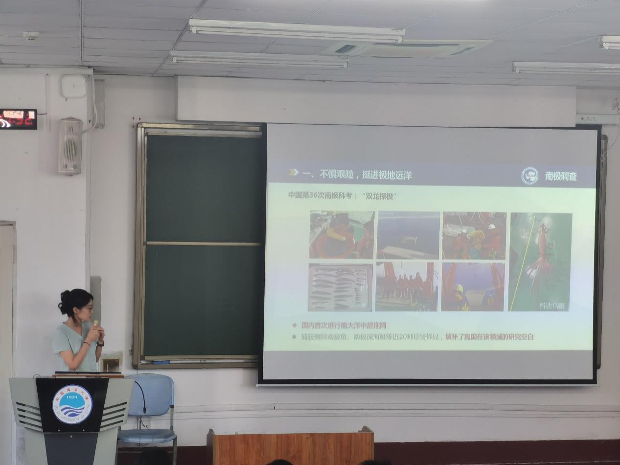 最后,郭慧琳博士为大家带来了题为《实验室远洋与极地渔业科考研究进展》的报告。她首先向大家介绍极地科考的研究工作经历,给大家展现了极地科考工作的艰苦以及所面临的种种困难,同时她也教会了大家如何去克服这些种种艰险,挺进极地远洋工作。接着,她向大家详细地介绍了“双龙探极”、南大洋渔业系统综合调查等中国南极科考工作,从这些工作对揭示南极海冰与生态系统、南极生物多样性等科学问题具有重要意义,同时也填补了我国在南极探索领域的研究空白。最后,她又向大家介绍了极地渔业科考研究的有关内容,同时也鼓励大家去积极学习,在将来能够更好去探究南极的未知领域。