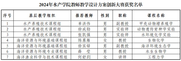 经过参赛教师提交教学设计方案、各基层教学组织组织专家进行审核推荐、学院组织专家进行评审等环节,根据评审专家意见,共有“甲壳动物增养殖学”等7门课程的教学设计方案荣获“最佳教学创新奖”。