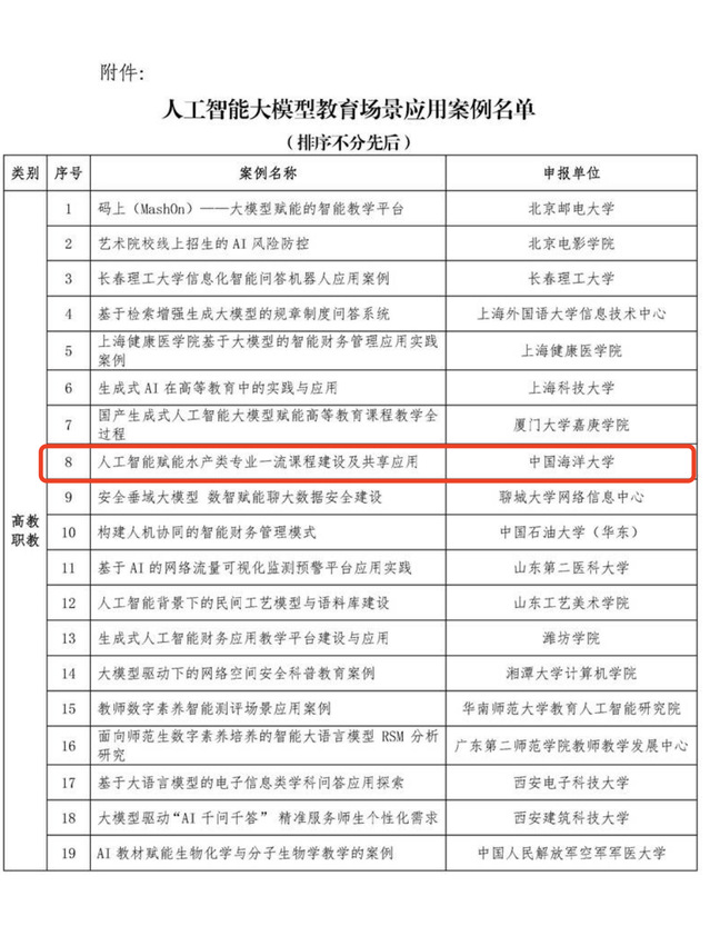 近日,中国教育信息化网发布了《关于公布人工智能大模型教育场景应用案例的通知》,御宅屋 推荐的“人工智能赋能水产类专业一流课程建设及共享应用”案例成功入选。