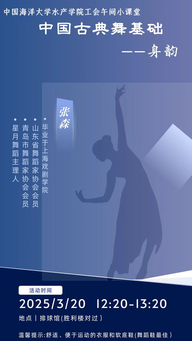 为丰富教职工业余生活,提升艺术素养,水产学院工会于2025年3月20日精心筹备了一堂别开生面的古典舞体验课程,活动邀请了专业舞蹈老师授课,吸引了鱼山校区不同单位工会对古典舞感兴趣的教职工积极参与,老师们在优雅舞姿中感受传统文化魅力,舒缓工作压力。