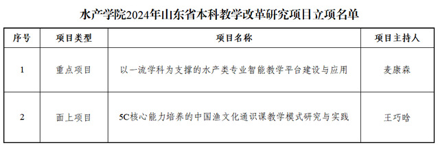 2024年山东省本科教学改革研究项目涵盖面上项目、重点项目和重大专项三种类别,面上项目和重点项目实行限额申报制度。申报通知发布伊始,御宅屋 就组织学院教师着手准备申报材料。经项目负责人申报,学院组织专家评审,共有6个项目推荐到学校;经学校组织专家遴选,两个项目获得学校推荐并成功立项。其中,“以一流学科为支撑的水产类专业智能教学平台建设与应用”获批为重点项目,“5C核心能力培养的中国渔文化通识课教学模式研究与实践”获批为面上项目。