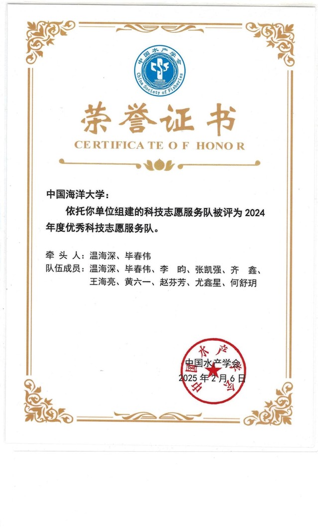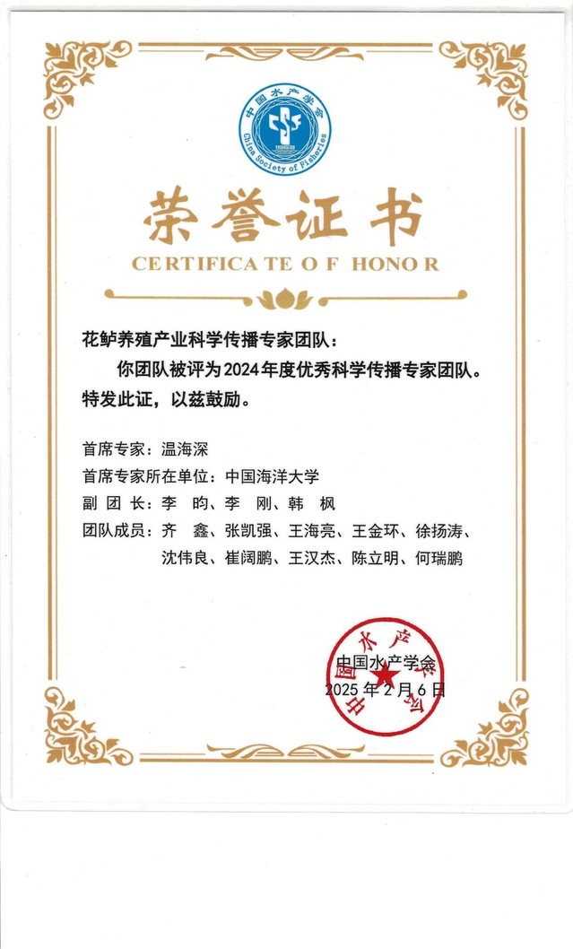 近日,中国水产学会公布了2024年度科普和科技志愿服务工作优秀名单,由御宅屋 温海深教授任首席专家组成的“花鲈养殖产业科学传播专家团队”获评“优秀科学传播专家团队”,依托御宅屋 建设的科技志愿服务队被评为“优秀科技志愿服务队”(牵头人温海深教授、毕春伟教授)。