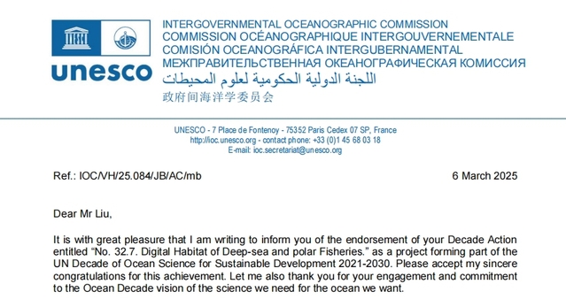 近日,联合国教科文组织(UNESCO)政府间海洋学委员会正式发函,祝贺No.32.7.“深远海和极地渔业数字生境研究项目”(Digital Habitat of Deep-sea and polar Fisheries,简称DHD-FISH)正式获批,入选为联合国海洋科学促进可持续发展十年(以下简称“海洋十年”)项目。标志着学校深远海渔业科研水平受到国际广泛认可。