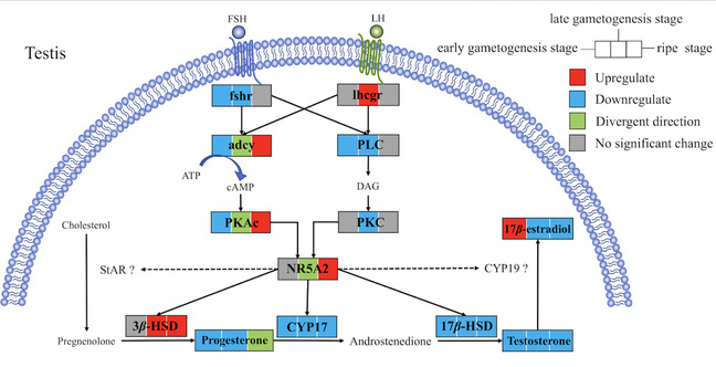 接下来,团队以雄性栉孔扇贝为研究对象,从双壳贝类性激素合成途径和精子生成两方面进行了系统性研究。研究分析了B[a]P对性腺指数和成熟精子数目的影响,证实B[a]P严重削弱了雄性栉孔扇贝的繁殖能力。在此基础上,通过检测性激素含量和性激素合成关键基因转录水平的变化,揭示了B[a]P可通过adcy-PKA和PLC-PKC信号通路抑制性激素合成酶基因转录,从而抑制性激素合成。此外,研究发现精巢中细胞周期蛋白(ccnd2)、联会复合体蛋白(SCP3)、核呼吸链因子(NRF1)和水通道蛋白(AQP9)基因表达量显著下调,证实B[a]P会通过阻碍精细胞的有丝分裂、减数分裂和能量代谢等关键过程,从而抑制精子生成和精巢发育。最后,组织显微结构表明B[a]P对雄性栉孔扇贝性腺造成了损伤效应,尤其在繁殖期更为显著。以上研究内容深入探究了多环芳烃对不同繁殖期雌性和雄性双壳贝类的生殖内分泌干扰效应及分子机制,为海洋污染生态风险评估及贝类种质资源保护提供了理论依据。