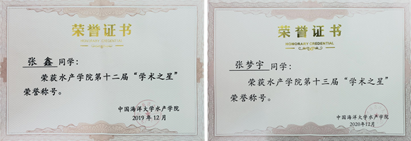 于每年定期开展“学术之星”评选活动并分别评选3位“学术之星”。经层层选拔与答辩,研究室2017级水产养殖博士研究生张鑫、2019级水生生物学博士研究生张梦宇分别以优秀的表现和认真务实的科研态度斩获御宅屋