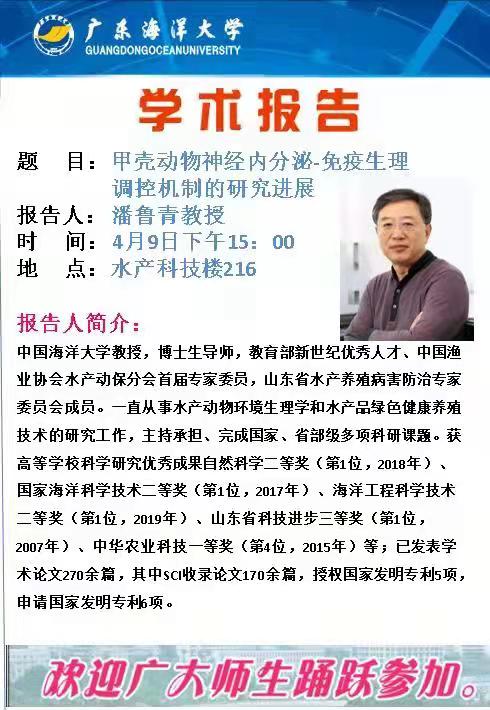师生做了《甲壳动物神经内分泌-免疫生理调控机制的研究进展》学术报告,从动物进化角度,阐述了无脊椎动物、脊椎动物神经内分泌-免疫防御的分子机制,为甲壳动物免疫学的研究提供了新思路,得到了师生的一致好评。4月10日上午,在广东海洋大学孙成波教授、刘泓宇教授陪同下,实地考察了广东海洋大学东海岛养殖基地,并就共同承担的广东省重点领域研发计划项目《海水池塘生态工程化养殖技术与模式》进行了商讨,制定了下一步研究计划。