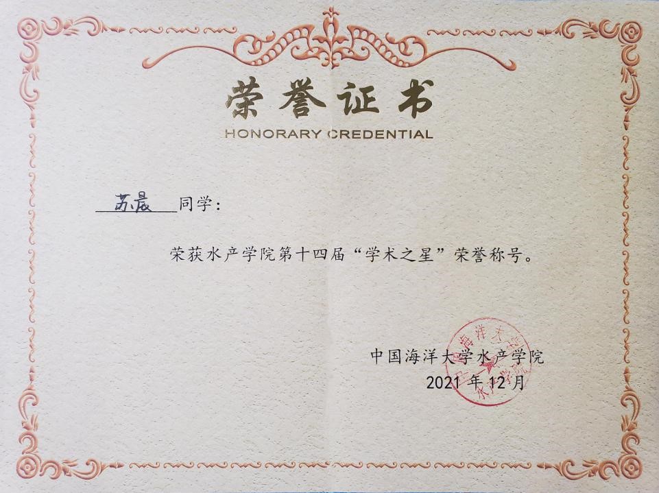 第十四届“学术之星”荣誉,“学术之星”每年仅评选3位研究生。