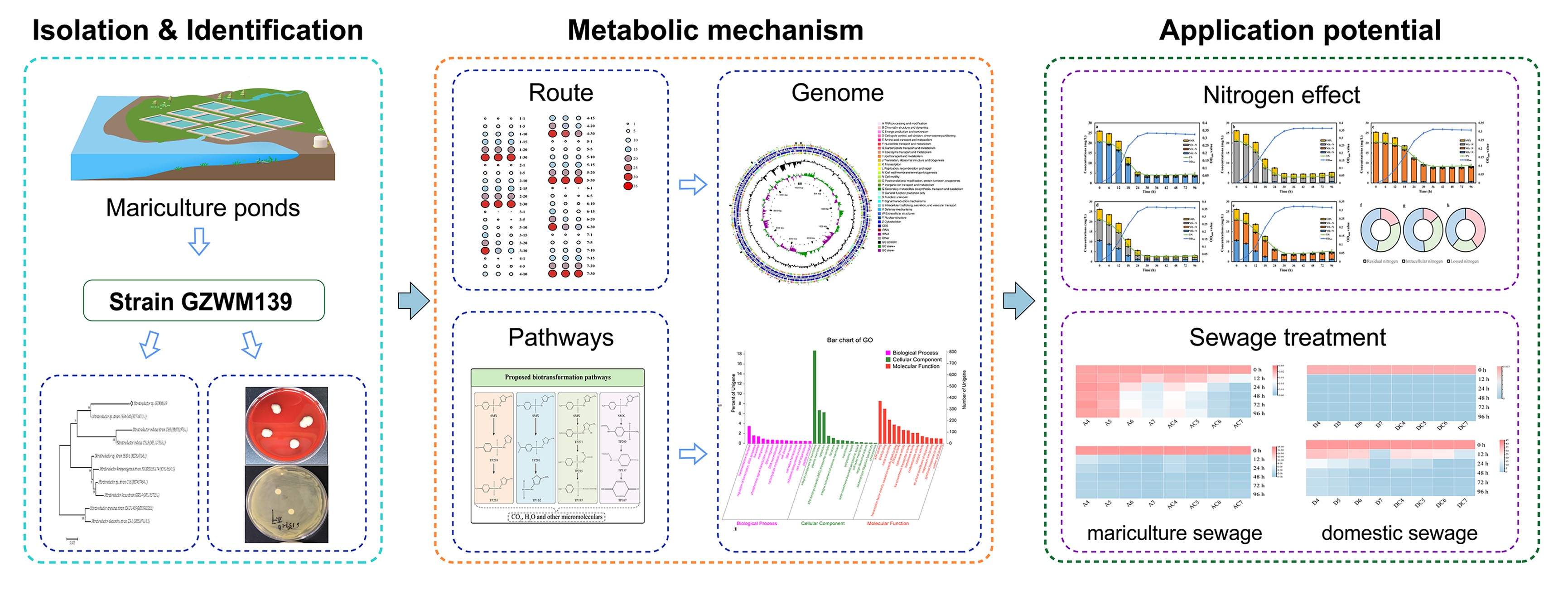 微生物降解法是目前最具潜力的抗生素消除技术。然而,目前已获得的能够适应水产养殖环境的降解磺胺甲恶唑菌株非常稀缺,且其降解机理尚不明晰。基于以上问题,本论文从对虾池塘养殖环境中分离得到一株高效磺胺甲恶唑降解菌株(Nitratireductor sp. GZWM139),该菌株对于不同环境因子(温度、盐度、pH、溶解氧)具有良好的适应性,并从降解方式、降解途径、细胞响应、基因解析四个方面阐明了该菌株对磺胺甲恶唑的降解机制,同时该菌株还具有高效的脱氮效能;应用实验表明该菌株对水产养殖尾水和生活污水中的磺胺甲恶唑、氮化合物具有良好的去除效果。该研究首次报道了硝酸盐还原菌属(Nitratireductor)的抗生素降解能力,不仅为磺胺甲恶唑消除提供了一株具有广泛应用前景的候选菌株,也为磺胺甲恶唑微生物降解机理提供了全面认知。