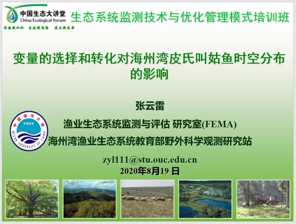 国内 会议 | 1 | 变量的选择和转化对海州湾皮氏叫姑鱼时空分布的影响 | 线上 | 2020.8.17-19 | 生态系统检测技术与优化管理模式培训班 | 张云雷 | 口头报告 | |