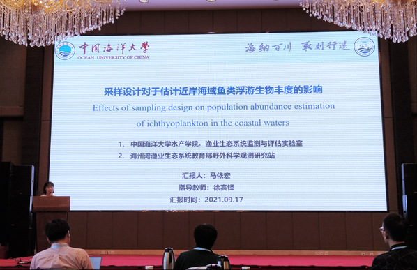 图3 马依宏进行《采样设计对估计近岸海域鱼类浮游生物丰度的影响》口头汇报