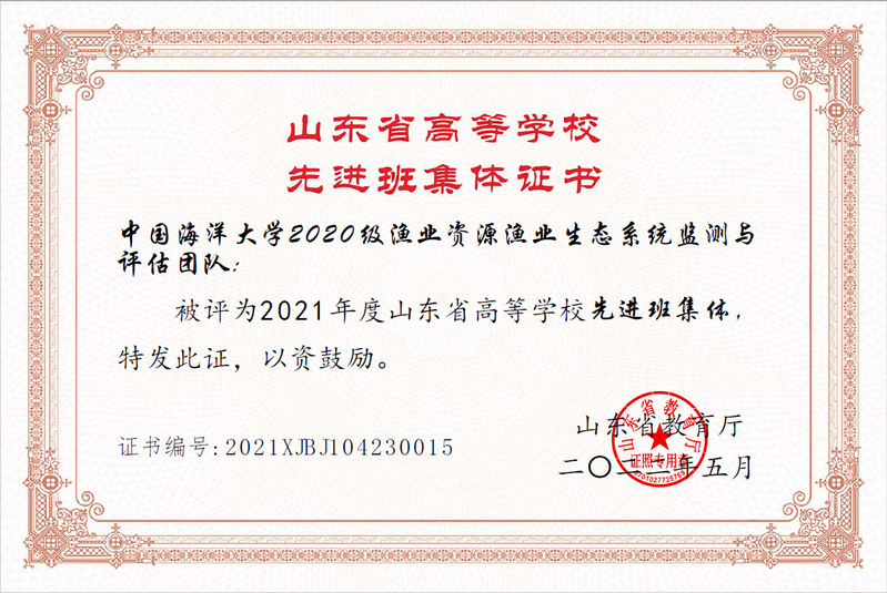 2022年4月24日,山东省教育厅发布了2021年度山东省高等学校优秀学生、优秀学生干部和先进班集体名单公示。其中,御宅屋 2020级渔业资源生态系统监测与评估团队被评为2021年度山东省高等学校先进班集体。