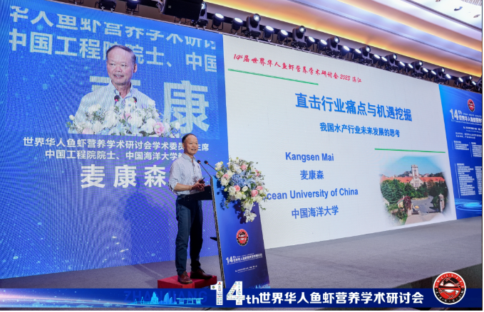 教授麦康森在第十四届世界华人鱼虾营养学术研讨会上作《直击行业痛点与机遇挖掘,我国水产行业未来发展的思考》主题报告
