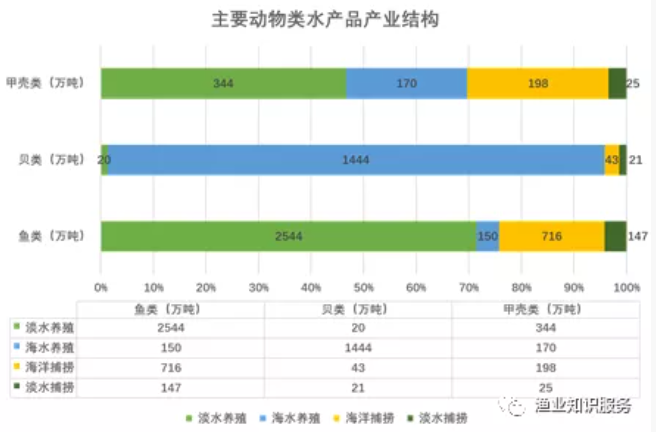1、中国渔业转型发展要求 1.1 水产品保障供给基本要求 动物蛋白质是人类生存与健康的基础性食物,水产品是重要的组成部分。中国渔业主要水产动物鱼类、虾蟹类、贝类产量总计6030多万t,占中国动物蛋白总产量的32%,已成为最大的动物蛋白生产行业。基于《中国统计年鉴(2019)》和《中国居民膳食指南》的研究表明,按照中国居民食物多样性平衡“膳食宝塔”水产品日摄入量40~75g计,水产品年人均需要量为27~50.5kg(平均值38.8kg);中国城镇居民水产品年人均消为29.6kg、农村居民为14.8kg。据预测,到2025和2035年,中国水产品供应总量将增加2466万t和5593万t。如果使5.64亿农村居民达到年人均消费27kg的最低水平,使8.13亿城镇居民达到年人均消费38.8kg的中值水平,就需要在现有基础上增加1420多万t产量,才能达到全面建设小康社会、满足人民美好生活需要的基本要求。就世界而言,20世纪60年代以后,全球食用水产动物消费量年均增长率超过了人口增长率,高于全部陆生动物肉类增长率,约占全球人口动物蛋白消费量的17%,提供了人均动物蛋白摄入量的近20%;2015年全球食用水产动物年人均消费量为20.2kg。FAO预测,到2030年全球水产品的产量将增加36.7%,中国将增加31.1%。 1.2 面临的制约性问题与空间拓展 1.2.1 产业构成及特点 中国渔业主要有水产养殖业、捕捞业、加工业、增殖业和休闲渔业5大产业形态,水产品的产量主要来自养殖和捕捞。图1所示为中国水产养殖与捕捞产业主要构成。