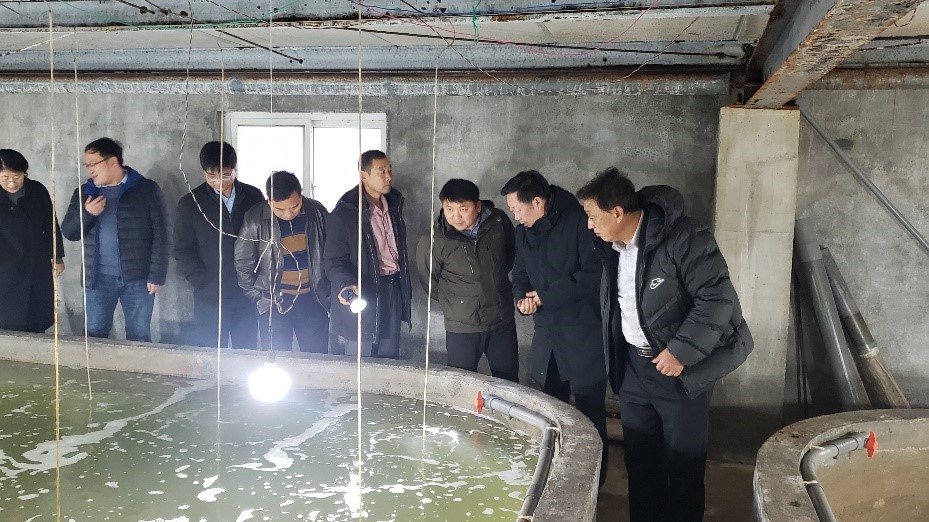2021年12月2日,温海深教授及团队成员同全国水产技术推广总站(推广总站)基地处处长李刚、副处长王庆龙等前往利津县双瀛水产苗种有限公司(双瀛公司)调研。东营市海洋发展和渔业局副局长王寿泰、科技局局长董永生、利津县组织部副部长朱丽霞、利津县农业农村局副局长孙桂芹等相关部门代表陪同调研。本次调研围绕花鲈繁育、苗种培育、产业化推广等问题展开。