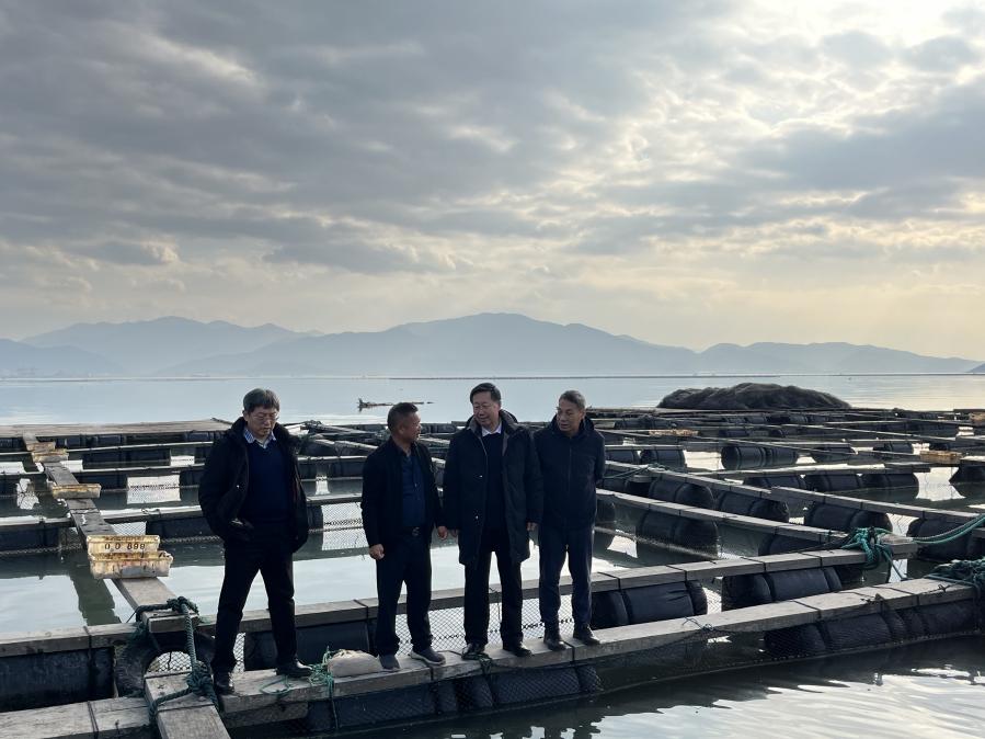 2024年1月9日,国家海水鱼产业技术体系岗位科学家温海深教授、中国科学院海洋研究所李军研究员、宁波市海洋与渔业研究院原副院长吴雄飞、国家海水鱼产业技术体系宁波综合试验站站长沈伟良工程师等一行6人前往宁波奉化市宏泰水产养殖有限公司(后简称宏泰公司)调研,主要围绕花鲈亲鱼养殖、苗种繁育等方面展开。 调研团一行首先参观了宏泰公司的养殖网箱,对养殖的花鲈养殖产量、运营模式、养殖模式、苗种繁育等方面进行调研。随后,调研团一行在养殖网箱上进行了现场座谈会,座谈会上,调研团一行同企业管理人员就寄生虫感染和弧菌感染的病害防控与治理、环境监测、花鲈亲鱼规范化管理、绿色健康养殖等方面进行了讨论,并为企业提供了有效、科学的改进意见。