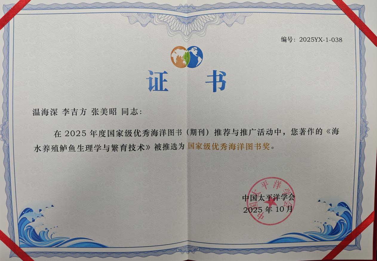 2025年10月,在中国太平洋学会开展的2025年度国家级优秀海洋图书(期刊)推荐与推广活动中,实验室教师温海深、李吉方、张美昭主编的《海水养殖鲈鱼生理学与繁育技术》荣获国家级优秀海洋图书奖。 中国太平洋学会(Pacific Society of China,PSC)是经民政部注册、自然资源部主管的全国性学术社团组织,成立于1984年1月。该学会以太平洋区域政治、经济、科技及海洋战略研究为核心,开展学术交流、决策咨询与国际合作,主办《太平洋学报》《太平洋通讯》等期刊,业务涵盖海洋发展战略研究、国际学术交流及海洋科技知识普及等领域 。目前下设60余家分支机构,形成跨学科、跨行业的综合性学术组织体系,经政府有关部门批准,表彰、奖励在太平洋区域发展各学科研究活动中取得优秀成绩的会员和科技工作者。