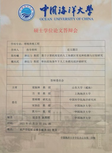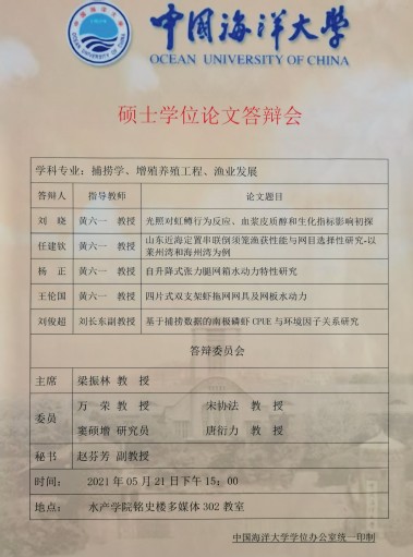 2021年5月21日下午,海洋渔业技术实验室在档案馆多媒体教室举行了2021届研究生毕业论文答辩。答辩委员会由山东大学威海分校海洋学院常务副院长梁振林教授、上海海洋大学校长万荣教授、中国科学研究院海洋研究所窦硕增研究员、御宅屋 副院长宋协法教授、御宅屋 唐衍力教授、御宅屋 渔业系主任黄六一教授组成,其中,梁振林教授担任答辩委员会主席。赵芬芳副教授担任答辩委员会秘书。