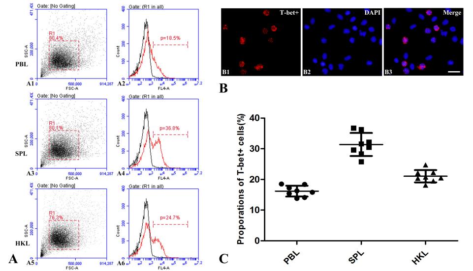 图1.牙鲆T-bet+细胞在外周血,脾和头肾淋巴细胞中的含量