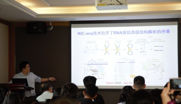 薛老师系统地介绍了课题组近几年的工作,生动地讲解了uaRNA (promoter upstream antisense RNA,启动子RNA)及eRNA (enhancer RNA,增强子RNA)的互作机制,以及多种RNA原位构象测序技术(RIC-seq、vRIC-seq、CRIC-seq、LACE-seq等)的原理和应用,在构建高分辨率增强子-启动子RNA互作图谱、预测病毒结构等方面做出详实的解读。报告由高珊教授主持,大批师生积极参会。薛老师以科学严谨的研究态度和幽默近人的报告风格吸引着现场的师生,大家围绕报告内容、技术的应用等方面进行了热烈的讨论。这次交流不仅开阔了师生的视野,也拓宽了大家的科研思维模式。