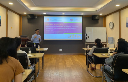 香港中文大学陈子桂教授近日到访原生动物学研究室,并于5月29日上午在达尔文馆学术厅呈现了题为“宿主-病毒共进化:乳头瘤病毒致癌性起源和进化适应”的精彩报告。陈老师从乳头瘤病毒的起源、类型多样性、传播机制、与癌症的关系等方面进行了系统、生动的讲解,激发了现场师生的热烈提问和讨论,营造了浓厚的学术氛围。报告会由高凤教授主持,来自鱼山校区的师生参加了会议。