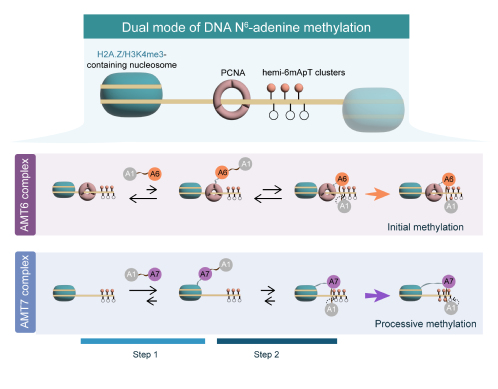 真核生物6mA在基因转录调控和染色质结构塑造中发挥着重要作用。团队前期以单细胞真核模式生物四膜虫为研究材料,系统解析了6mA的分布模式[6]、甲基转移酶[7]及其在细胞生长发育中的功能和调控通路[8],并发现6mA以经典的半保留方式进行稳定遗传[9]。然而,特异性分布的6mA位点如何精准且高效地传递给后代,尚不清楚。