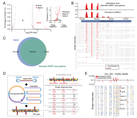 图2. SMAC灵敏准确的6mA检测。(A)6mA阳性样品(native)与阴性对照(WGA)A位点IPD比值分布。(B)SMRT-seq标准分析流程与SMAC在代表性基因组区域的6mA检测结果的比较,同时展示复合水平与单分子水平的6mA位点。(C)SMRT-seq标准分析流程与SMAC分析6mA位点的重合度。(D)SMRT-seq标准分析流程与SMAC检测6mApT对称性的原理示意图。(E)SMRT-seq标准分析流程与SMAC在代表性基因组区域的6mA对称性检测结果的比较,同时展示复合水平与单分子水平的6mA位点。