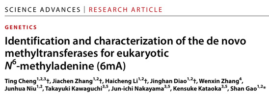 10. Liang, Z., Shen, L., Cui, X., Bao, S., Geng, Y., Yu, G., Liang, F., Xie, S., Lu, T., Gu, X., and Yu, H., DNA N6-adenine methylation in Arabidopsis thaliana. Developmental Cell, 2018. 45(3): 406-416.
