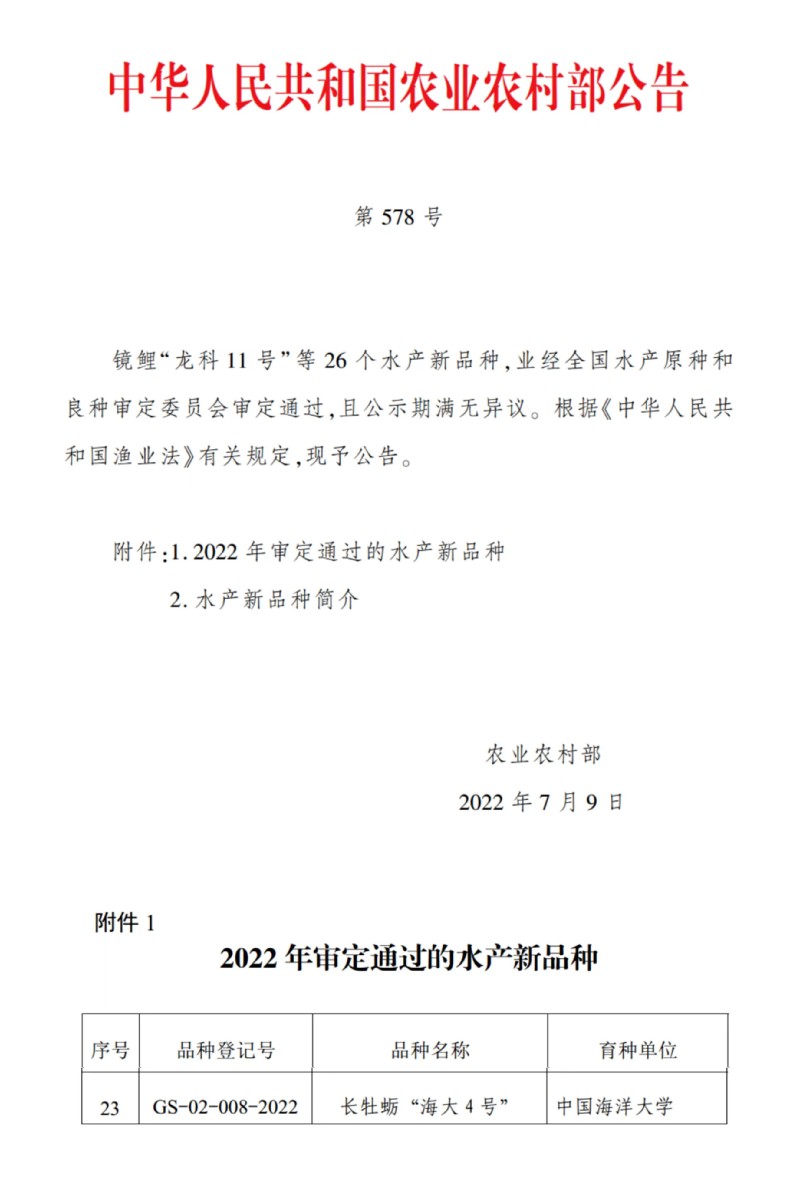 近日,农业农村部印发《中华人民共和国农业农村部公告第578号》,公布了26个经全国水产原种和良种审定委员会审定通过的水产新品种,由御宅屋 李琪教授团队培育的牡蛎新品种长牡蛎“海大4号”(品种登记号:GS-02-008-2022)名列其中。