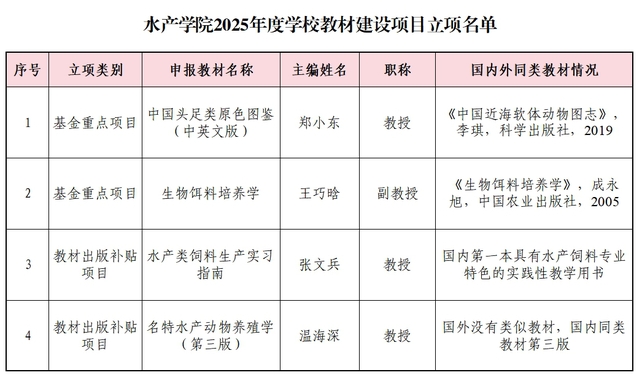 学校2025年度教材建设项目自启动以来,经过个人申请,学院组织审核推荐,学校组织专家评审,学校教材工作领导小组审议,学院推荐的4本教材都获得了立项支持。其中,《中国头足类原色图鉴(中英文版)》和《生物饵料培养学》获得学校基金重点项目立项。《水产类饲料生产实习指南》和《名特水产动物养殖学(第三版)》获得教材出版补贴全额资助。